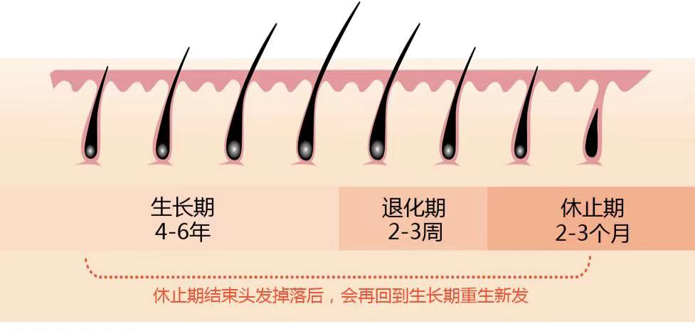 正常的頭皮大約存活著10-15萬個毛囊,這些毛囊有著規(guī)律的生長周期。其中90%-95%的毛囊處于生長期,1%-2%的毛囊處于退行期,而剩下約5%-10%的毛囊則處于休止期,通常持續(xù)2-3個月。正常情況下,處于退行期和休止期毛囊的毛發(fā)將會自行脫落,隨之長出新生毛發(fā)。也就是說,一天下來如果脫落的毛發(fā)數(shù)量不超過100-150根,是屬于毛發(fā)正常的脫落范圍。