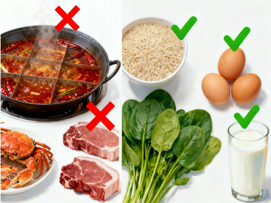 辛辣食物、海鮮、羊肉、酒精這些 “發(fā)物” 和刺激性食物,可能會(huì)加重炎癥反應(yīng),盡量忌口?梢远喑孕└缓 B 族維生素的食物,比如燕麥、糙米、菠菜、雞蛋、牛奶,這些都是神經(jīng)修復(fù)必需的 “營養(yǎng)劑”;另外,多喝水、多吃新鮮蔬果,保持大便通暢,也能減少身體負(fù)擔(dān)。