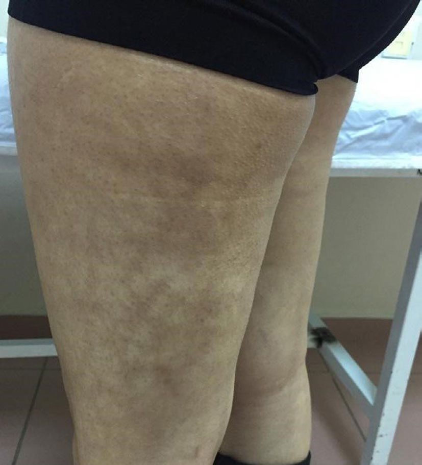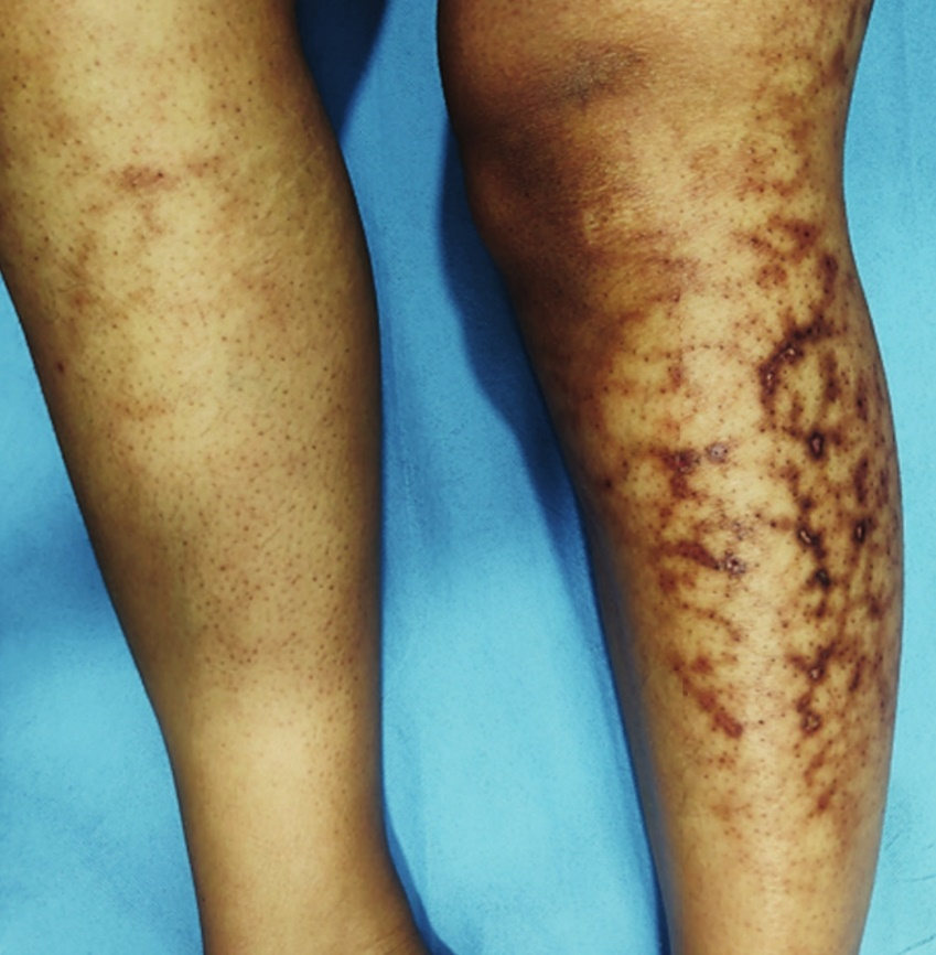 最初表現(xiàn)為短暫性網(wǎng)狀紅斑,隨之變?yōu)檫吔缜非宓牡t色、暗紅或紫紅色,最后可變?yōu)楹稚咂⒖沙霈F(xiàn)網(wǎng)狀毛細(xì)血管擴(kuò)張和色素沉著斑,皮損大小及分布多與與熱源接觸部位一致,少數(shù)可以發(fā)生水皰、皮膚萎縮、角化過度等;患者自覺癥狀不明顯,偶有輕度燒灼感。