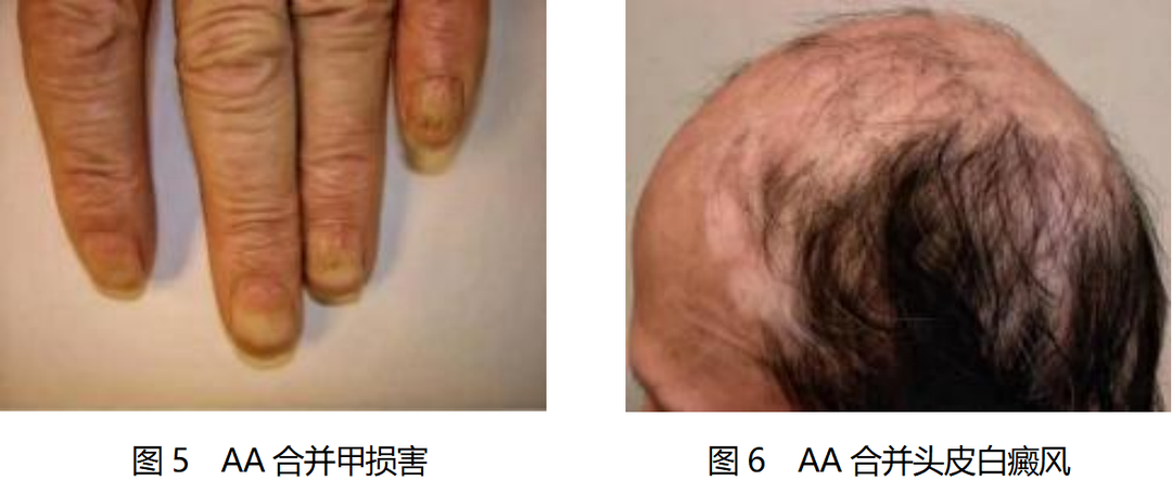 目前研究認(rèn)為,斑禿的發(fā)病與自身免疫失衡、毛囊免疫豁免喪失、情緒應(yīng)激、遺傳等因素有關(guān)。同時(shí)斑禿與許多系統(tǒng)性疾病相關(guān),10%~66%患者可同時(shí)出現(xiàn)甲損害(圖5),10%~22%患者伴有特應(yīng)性素質(zhì),8%~28%患者伴有自身免疫性甲狀腺病,1%~4%患者伴有白癜風(fēng)(圖6)。