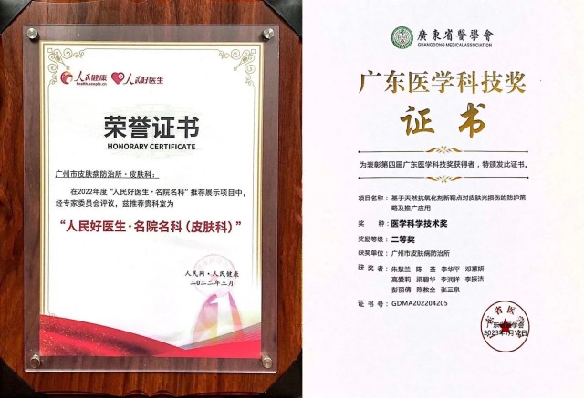 8、我所榮獲人民網(wǎng)“人民好醫(yī)生·名院名科(皮膚科)”榮譽稱號。朱慧蘭教授團隊研究項目獲廣東省醫(yī)學會醫(yī)學科學技術(shù)二等獎。