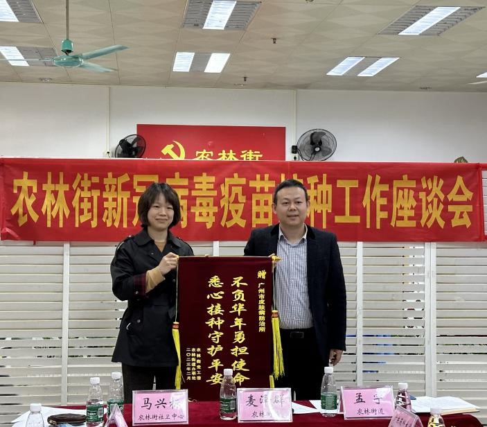2023年2月17日下午,受廣州市越秀區(qū)農(nóng)林街黨工委和街道辦事處邀請,廣州市皮膚病防治所派代表參加了“農(nóng)林街新冠病毒疫苗接種工作座談會”,并獲頒印有“不負(fù)華年勇?lián)姑,悉心接種守護(hù)平安”的錦旗一面。