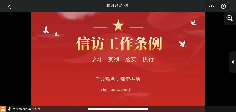 2022年5月30日中午,門診部全體工作人員在門診部黨支部書記李振潔同志的主持下,認真學(xué)習(xí)了《信訪工作條例》,熟悉了條例主要內(nèi)容,為更好地投入臨床工作打下堅實基礎(chǔ)。支部黨員線下集中學(xué)習(xí),其他工作人員線上聽講,線上線下相結(jié)合,創(chuàng)新而高效地達到了學(xué)習(xí)效果。