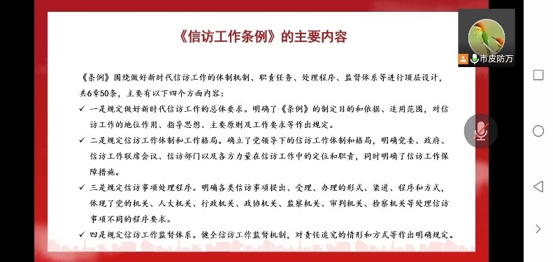 李振潔同志從《信訪工作條例》的制定背景、重要意義、主要內(nèi)容、適用范圍、工作體制、信訪人要求、受理辦理程序、監(jiān)督體系、宣傳落實等主要方面一一進行了重點解讀,并有感而發(fā),聯(lián)系當前的實際工作,提出各部門相關(guān)的改進意見和措施,鼓勵全體工作人員盡職盡責(zé)、與時俱進、共克時艱,一起努力高質(zhì)地完成臨床工作,幫助群眾解決疾苦。廣州市皮防所黨委成員、副所長張三泉同志,現(xiàn)場參加了線下的集中學(xué)習(xí),認真聆聽解讀,肯定了此次學(xué)習(xí)的意義和效果。