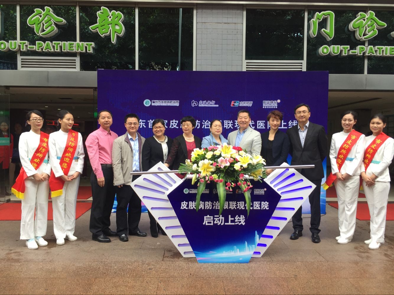 在銀聯(lián)現(xiàn)代醫(yī)院上線啟動(dòng)會(huì)的最后,廣州市衛(wèi)計(jì)委信息統(tǒng)計(jì)處匡艷陽副處長、廣州市皮防所所長王建琴、黨委書記張錫寶、副所長葉興東、中國銀聯(lián)廣東分公司創(chuàng)新推廣部副總經(jīng)理練恒光、交通銀行廣東分行信息技術(shù)部總經(jīng)理?xiàng)盍⑽摹⒅协h(huán)支行行長謝婭婷以及陽光康眾CEO遠(yuǎn)志一起推動(dòng)拉桿,標(biāo)志著廣東首家皮膚病防治銀聯(lián)現(xiàn)代醫(yī)院正式在我所啟動(dòng)上線。