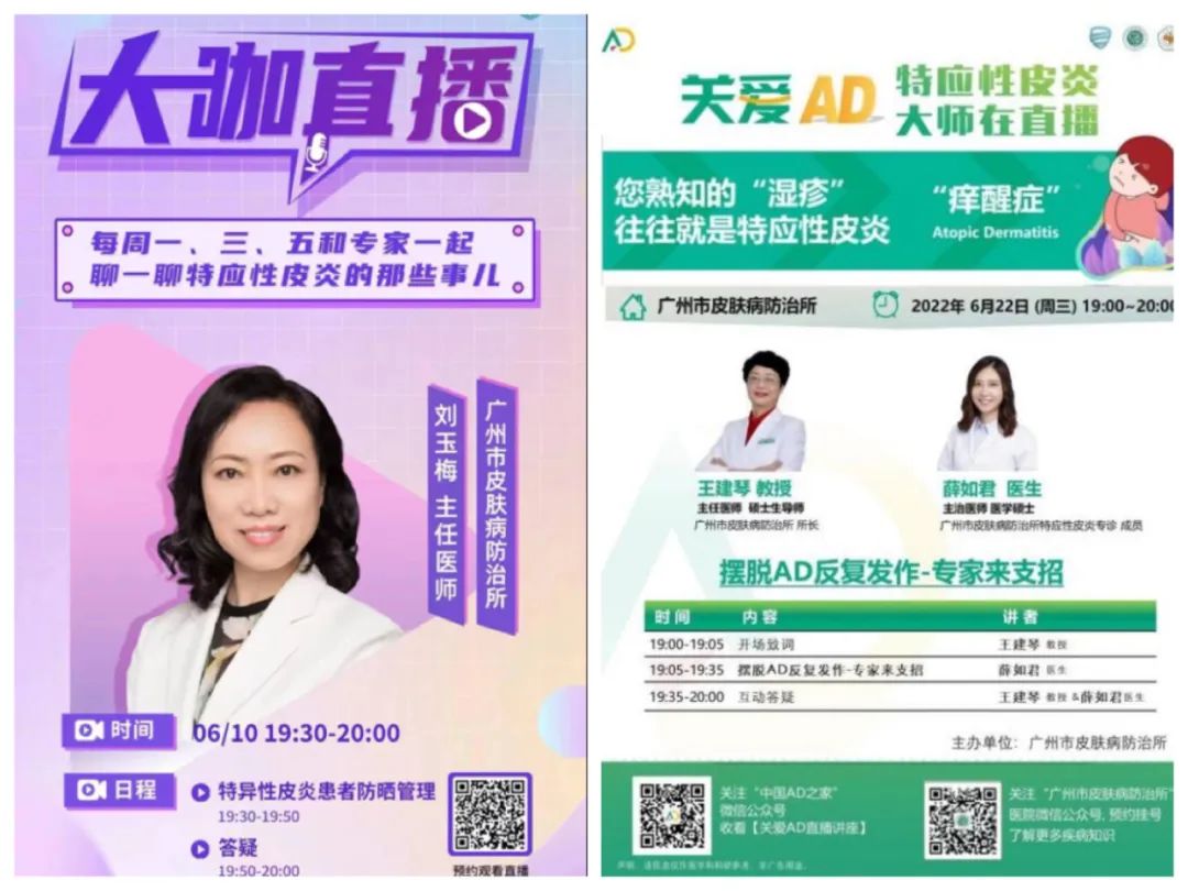 皮膚病防治科分別于6月10日、6月22日開展兩場線上特應(yīng)性皮炎患教講座,由我所AD專病門診醫(yī)生進行線上答疑。6月10日晚上劉玉梅教授為患者講授“特應(yīng)性皮炎患者防曬管理”;6月22日晚王建琴教授和薛如君主治醫(yī)師為AD 患者進行“如何擺脫AD反復(fù)發(fā)作”患教講座,線上互動答疑非;钴S,專家們?yōu)榛颊呓獯鹑粘Wo理的疑惑與誤區(qū),參會患者近300人。