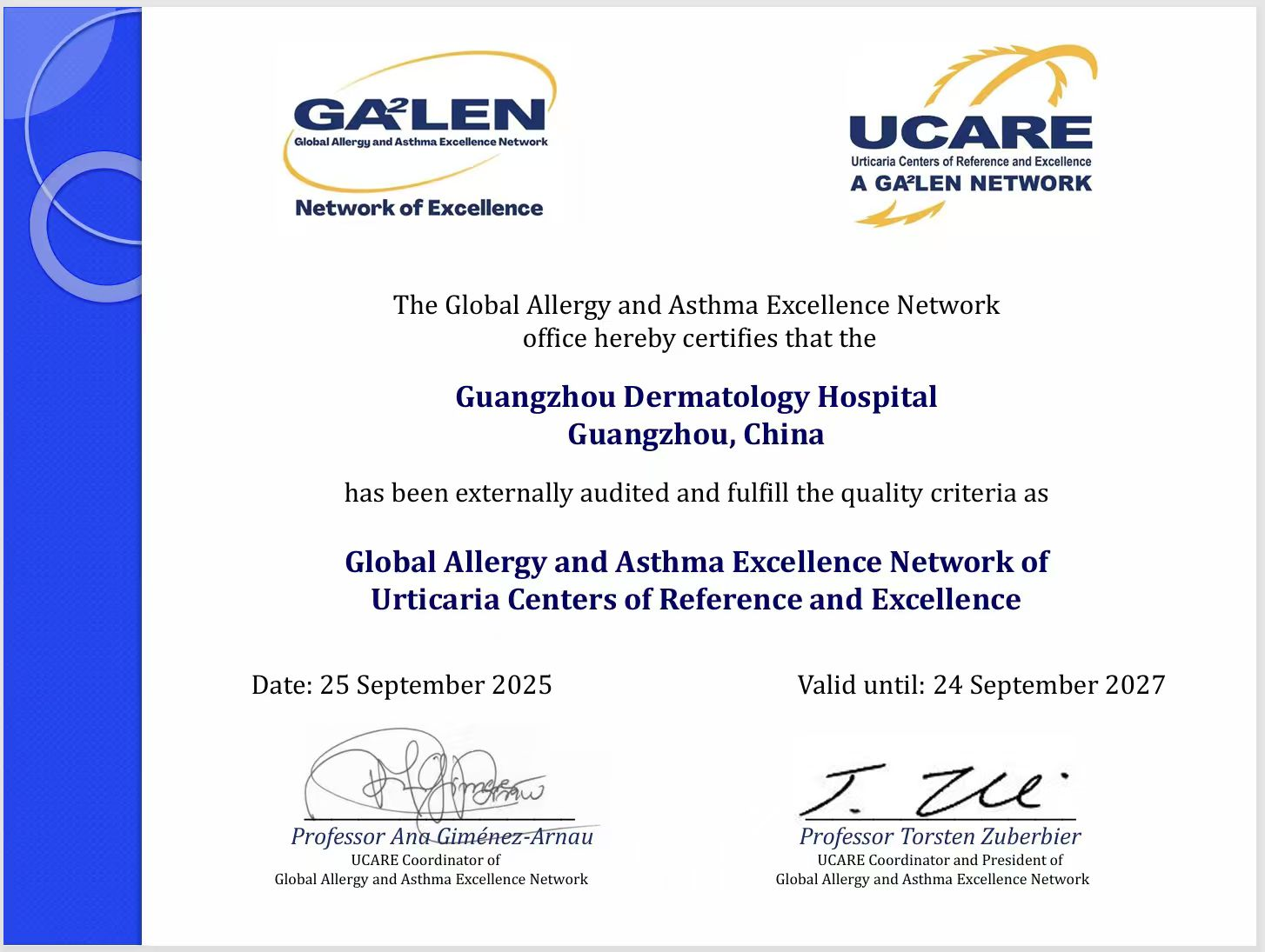 2025年11月20日,我院正式獲得全球過敏與哮喘歐洲網(wǎng)絡(luò)(Global Allergy and Asthma European Network, GA²LEN)頒發(fā)的UCARE(Urticaria Centers of Reference and Excellence)認(rèn)證。這一國際權(quán)威認(rèn)證標(biāo)志著我院在蕁麻疹專病領(lǐng)域的診療水平、科研能力與疾病管理體系已達(dá)到全球領(lǐng)先標(biāo)準(zhǔn)。
