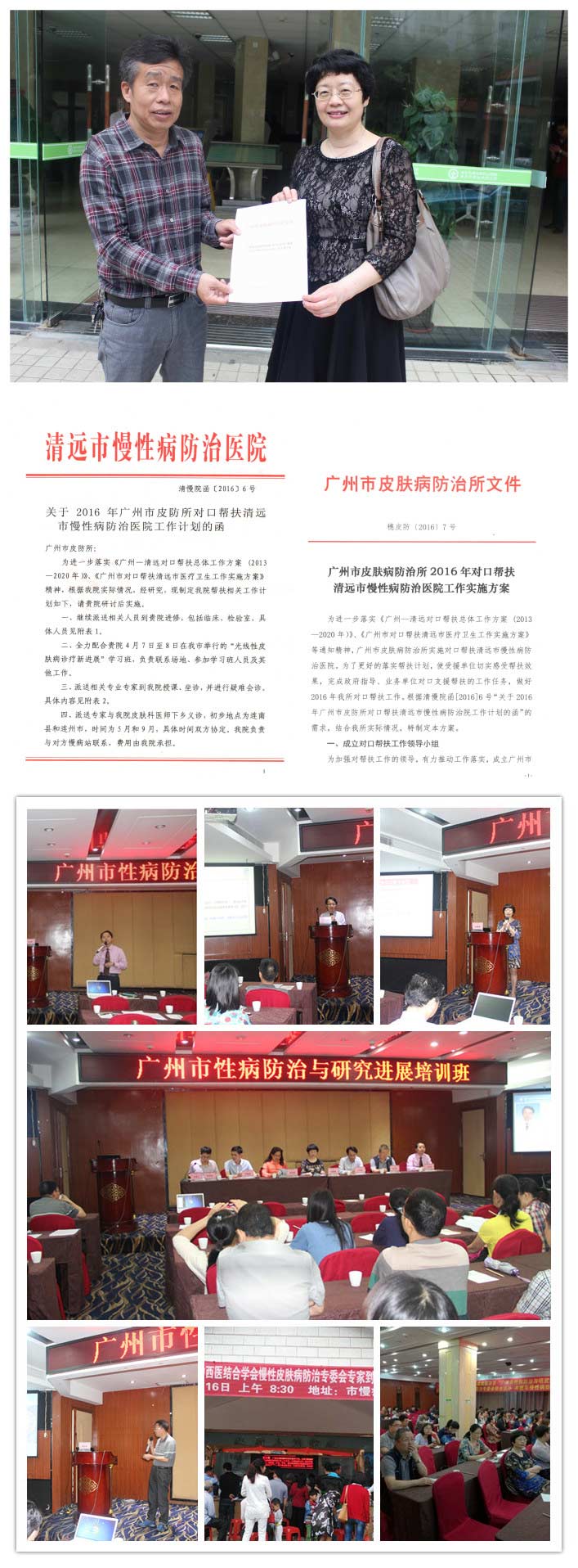 為進一步落實《廣州—清遠對口幫扶總體工作方案 (2013—2020年)》、《廣州市對口幫扶清遠市醫(yī)療衛(wèi)生工作實施方案》等文件精神,2016年4月7-8日、2016年4月15-16日廣州市皮膚病防治所王建琴所長誠邀國內(nèi)知名皮膚性病科專家分別到清遠市慢性病防治醫(yī)院、英德市慢性病防治醫(yī)院開展對口幫扶工作,幫扶工作包括交換幫扶方案、國內(nèi)知名專家現(xiàn)場指導(dǎo)及業(yè)務(wù)查房、開展專題業(yè)務(wù)學(xué)習(xí)、開展專家義診、贈送藥品等,幫扶工作都受到清遠市衛(wèi)計局、英德市衛(wèi)計局、清遠市慢病院、英德市慢病院的高度重視,并取得良好成效。