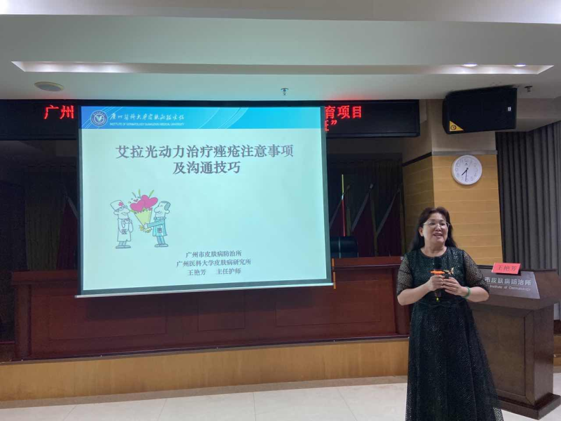 廣州市皮膚病防治所主任護(hù)師王艷芳對(duì)《艾拉光動(dòng)力治療痤瘡注意事項(xiàng)及溝通技巧》進(jìn)行分享,王主任結(jié)合多年臨床經(jīng)驗(yàn)病例,為大家講解艾拉光動(dòng)力治療痤瘡的適應(yīng)癥、原理、治療步驟,以及治療過(guò)程中的溝通技巧,讓在座的護(hù)理人員充分掌握艾拉光動(dòng)力治療痤瘡的方法和技能。