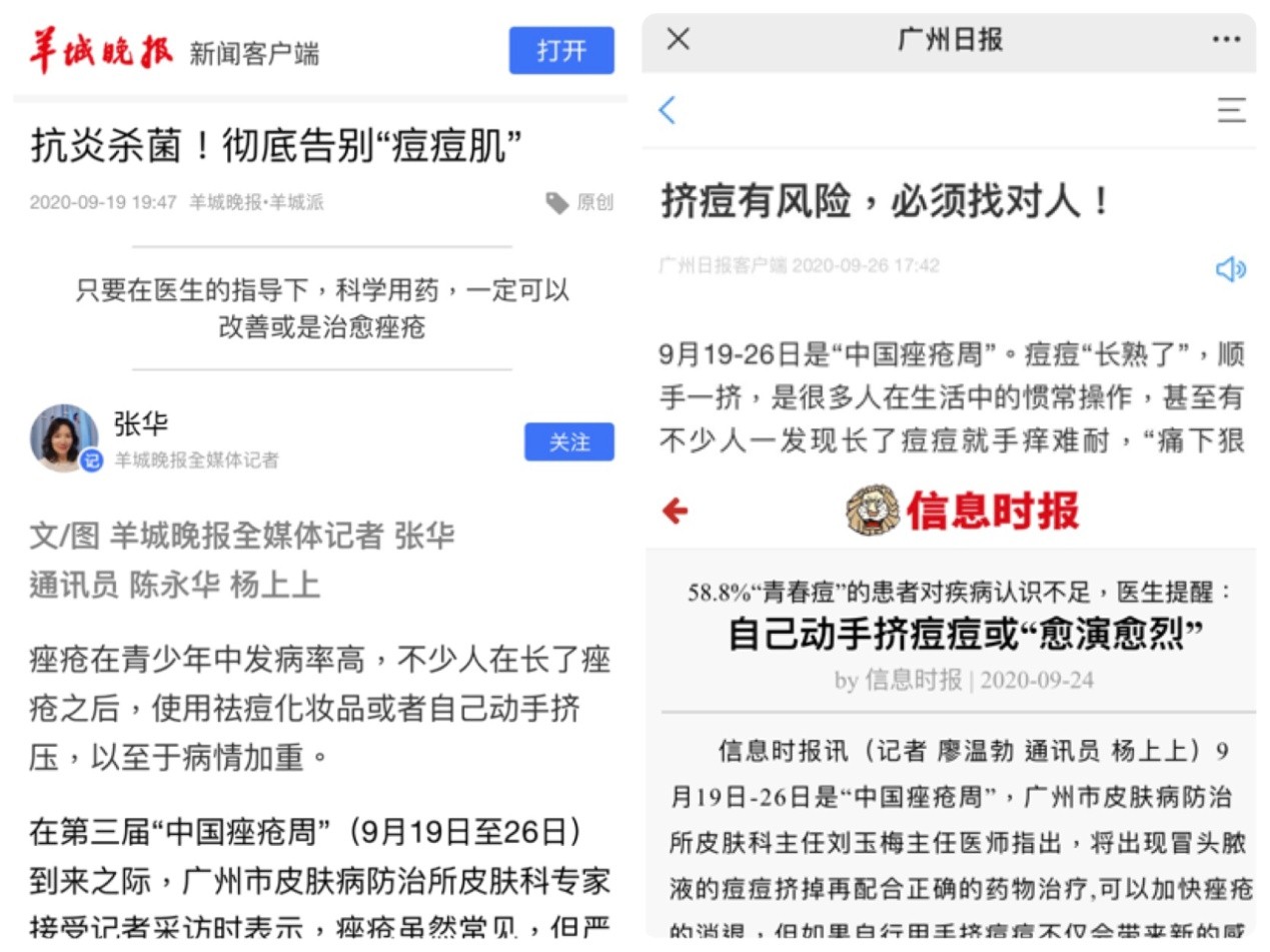 痤瘡雖俗稱“青春痘”,多發(fā)于青春期人群,但也有不少兒童或成人患有不同程度的痤瘡。全國調(diào)查結(jié)果表明,僅有41.2%的痤瘡患者選擇到醫(yī)院尋求專業(yè)治療及預(yù)防指導(dǎo),其余58.8%的痤瘡患者均采取不正規(guī)的治療方案。為了廣泛宣傳“中國痤瘡周”,向公眾普及痤瘡健康防治知識,義診活動前一周即9月17日,皮膚科主任劉玉梅主任醫(yī)師和張淑娟主治醫(yī)生接受了羊城晚報、廣州日報與信息時報三家報紙媒體的采訪,科普了痤瘡的防治知識,包括痤瘡類型、癥狀與發(fā)病機(jī)制、誘發(fā)和加重因素、治療與緩解手段等等,特別就痤瘡患者關(guān)心的問題進(jìn)行科普,糾正了一些“深入人心”的治療誤區(qū)。相較于晦澀難懂的專業(yè)醫(yī)學(xué)術(shù)語,通俗易懂又實(shí)用的痤瘡科普文章在各大報紙相繼登出后,獲得廣泛好評,受到群眾的一致肯定。