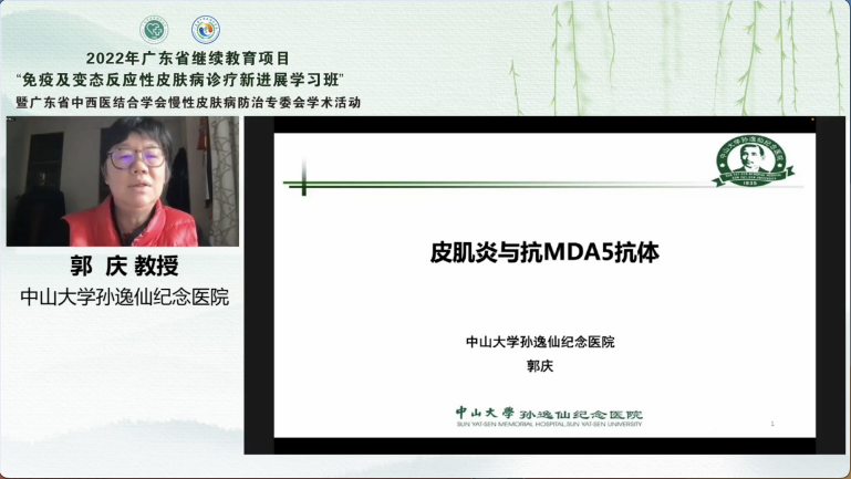中山大學孫逸仙紀念醫(yī)院皮膚科主任醫(yī)師郭慶教授為大家?guī)砹恕镀ぜ⊙着c抗MDA5抗體》的講座。郭教授帶領大家回顧了皮肌炎的臨床特征、分型以及診斷標準,并且介紹了一種抗MDA5抗體陽性的皮肌炎特殊亞型,該亞型是一組以間質性肺炎和皮疹為特點的多系統(tǒng)炎性病變,臨床上應引起重視。