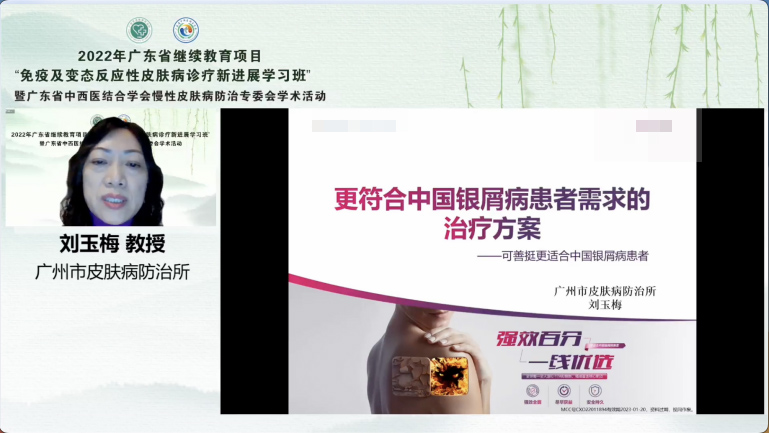 廣州市皮膚病防治所皮膚病防治科學科帶頭人、本次學習班項目負責人劉玉梅教授為學員們帶來了題為《更符合中國銀屑病患者需求的治療方案》的講座。銀屑病不僅從外觀上困擾患者,還伴隨著一系列共病,因此需要能快速清除皮損、安全且療效持久、減少復發(fā)的治療方案,其中針對亞洲人群靶點的生物制劑在銀屑病的治療上有著令人滿意的療效。