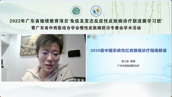 廣州市皮膚病防治所副所長張三泉教授為學員們帶來了《2020版中國系統(tǒng)性紅斑狼瘡診療指南解讀》。張教授基于近年來中國的臨床數(shù)據(jù),通過對中國新版系統(tǒng)性紅斑狼瘡診療指南的解讀,帶著學員們回顧了該病的臨床癥狀、診斷標準以及治療原則,提倡早期、個體化的治療,最大程度延緩疾病進展,改善預后。